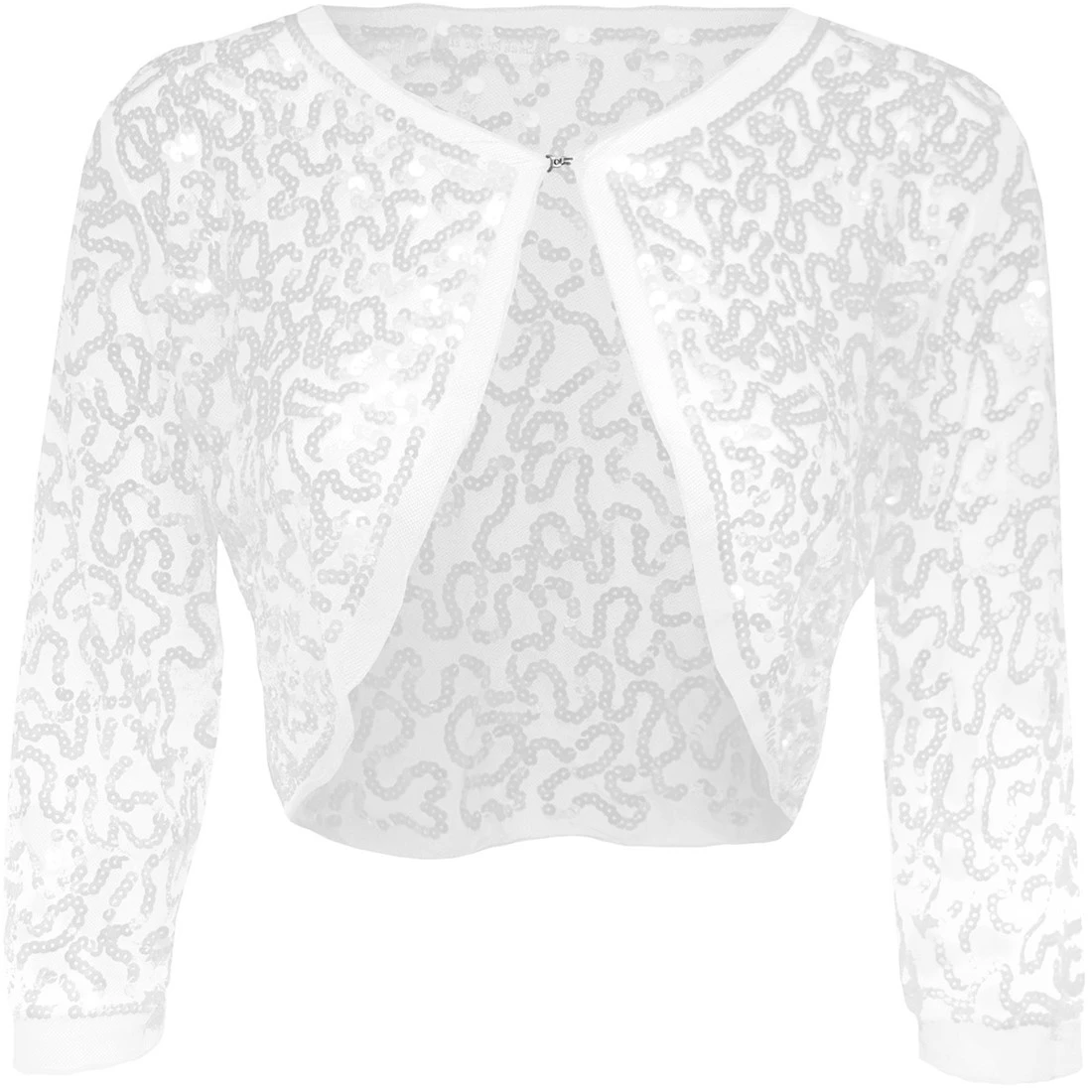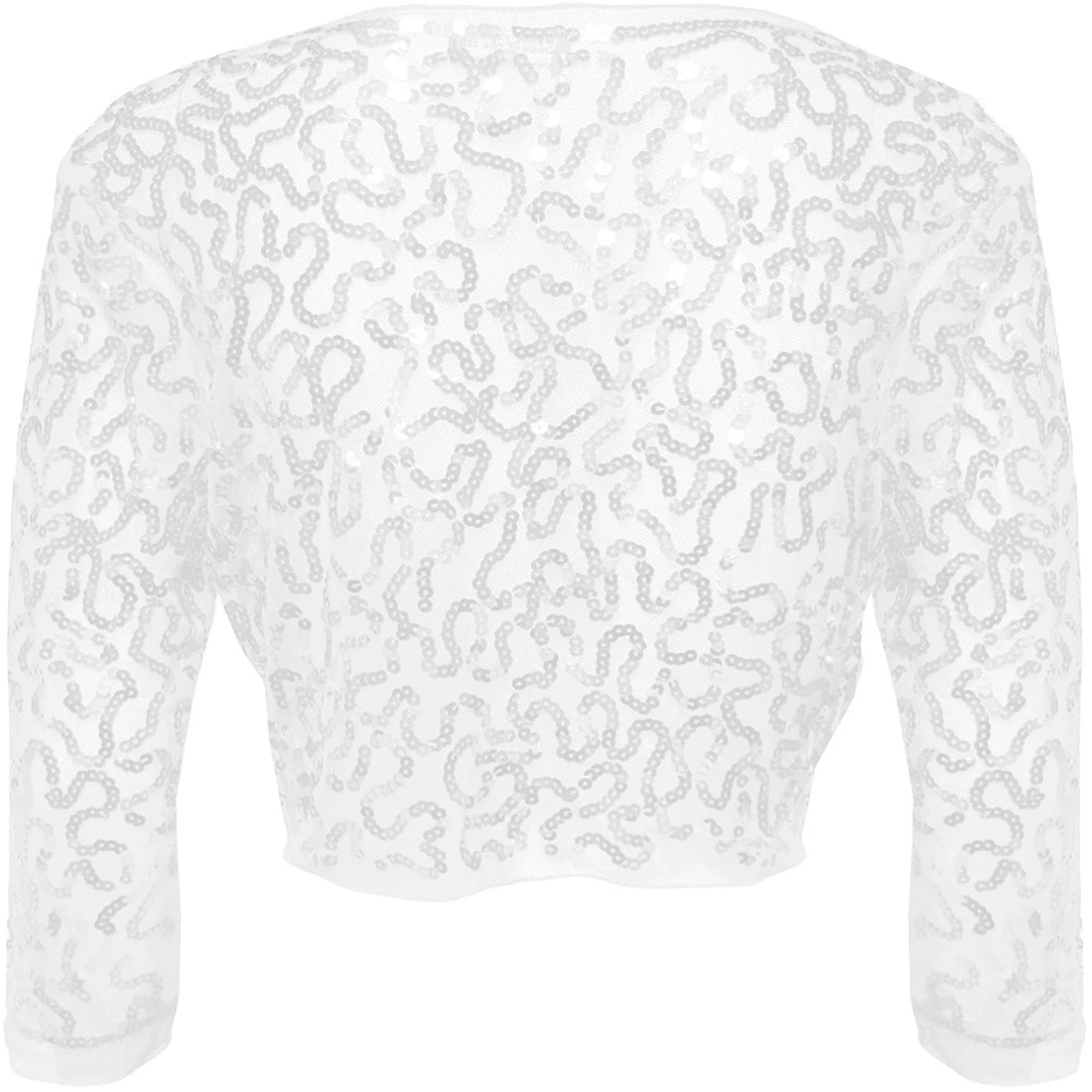 Een mooie wit kleurige bolero met witte pailletten. De bolero sluit aan de voorkant doormiddel van een klein haakje. Ook verkrijgbaar in andere kleuren.