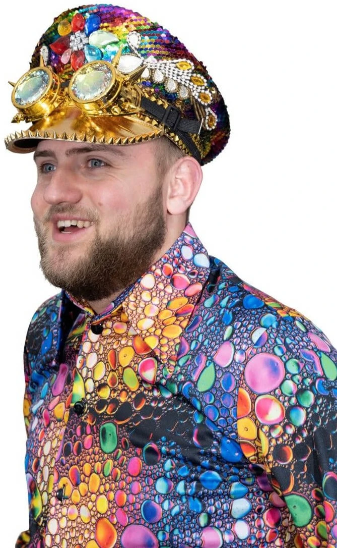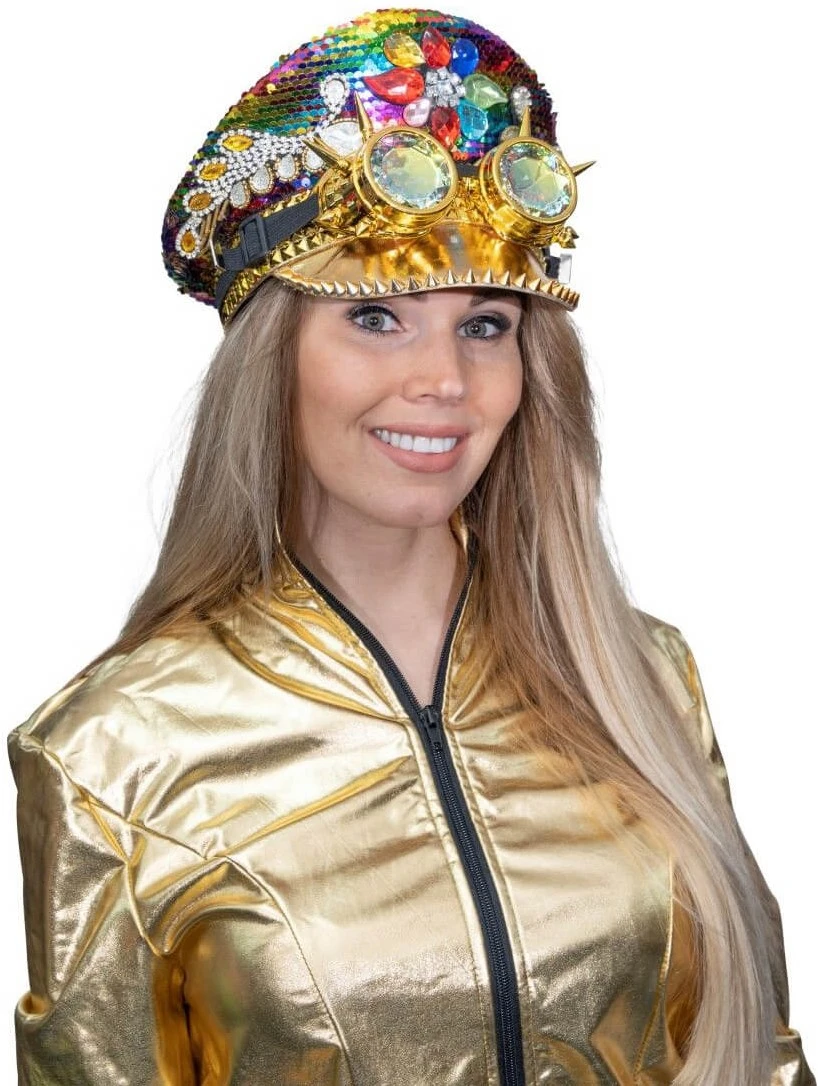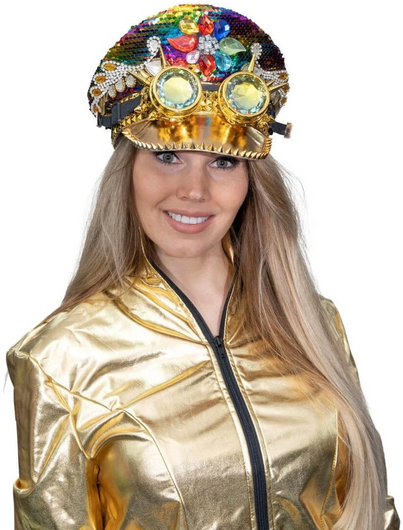 Details: afgewerkt met nep edelstenen, gouden spikes en steampunk bril met spikes