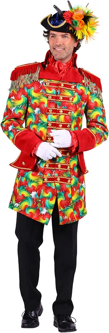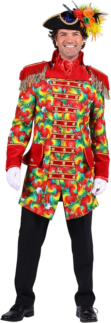 Een gave carnavalsjas voor heren, met prachtige gouden details! Deze vrolijke herenjas heeft in de carnavalskleuren een “wervel” print. De epauletten zijn voorzien van twee lagen franjes, wat voor een extra luxe look zorgt.