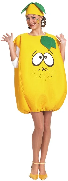 Op het gele citroen pak staat een leuk zuur gezichtje. Zowel geschikt voor mannen als vrouwen. One size.