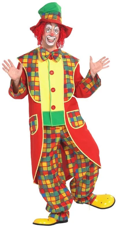 Clownskostuum met hoge hoed. Mooie compleet clown kostuum bestaande uit een broek, bovenstuk met jas, strik en hoge hoed. Pruik apart verkrijgbaar.