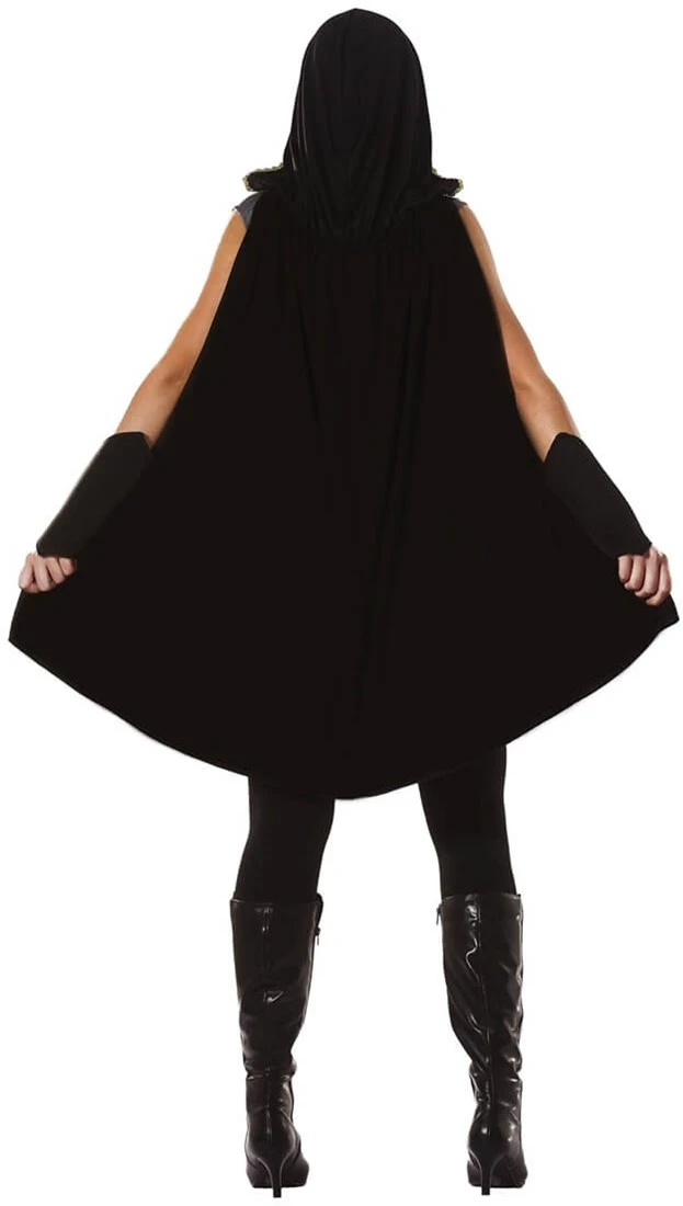 Details: mouwloze jurk met cape eraan vast. Over de buste loopt een lederlook band en om het middel een riem met een gouden print