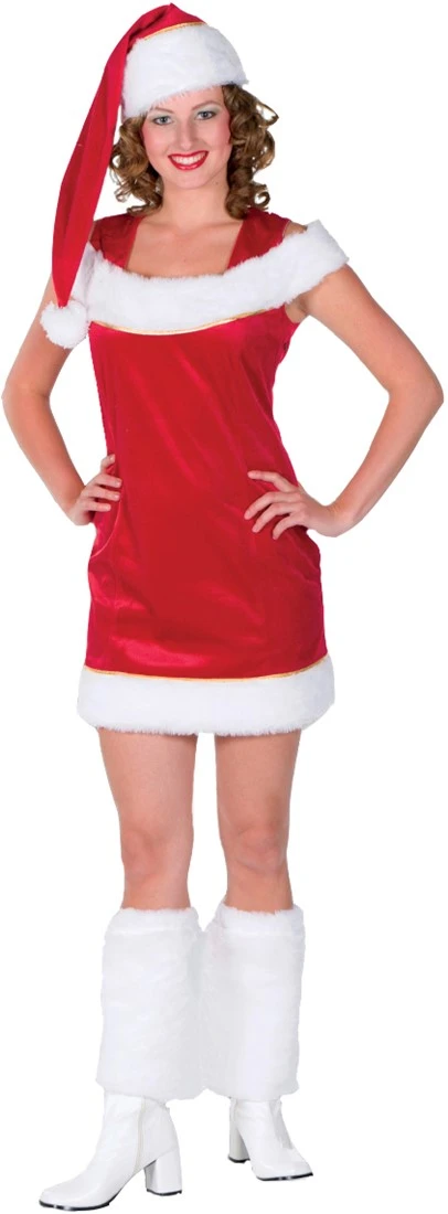Mooi luxe en sexy kerstvrouw pak voor dames, bestaande uit de kerstmuts, de jurk en beenwarmers.