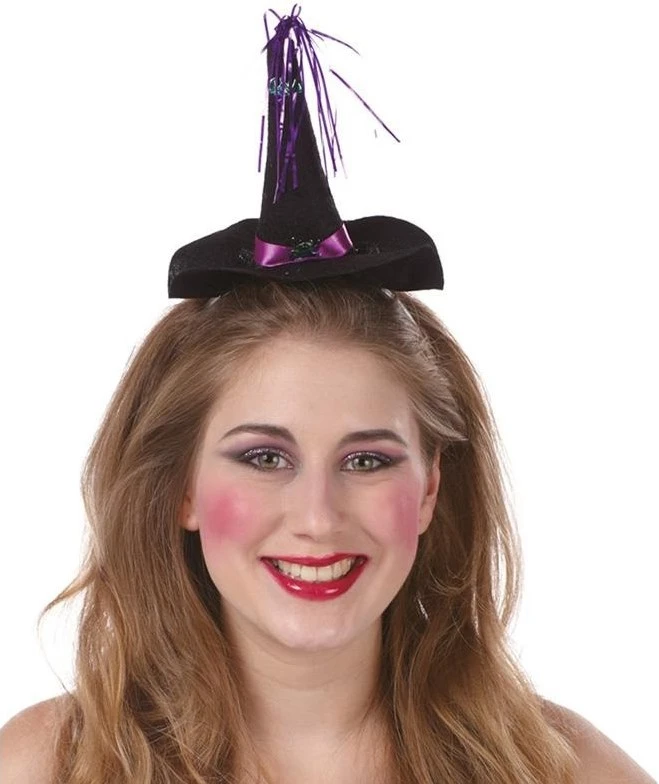 Details: zwart vilten heksenhoedje met op de punt een vleermuis en afgewerkt met leuk slinger