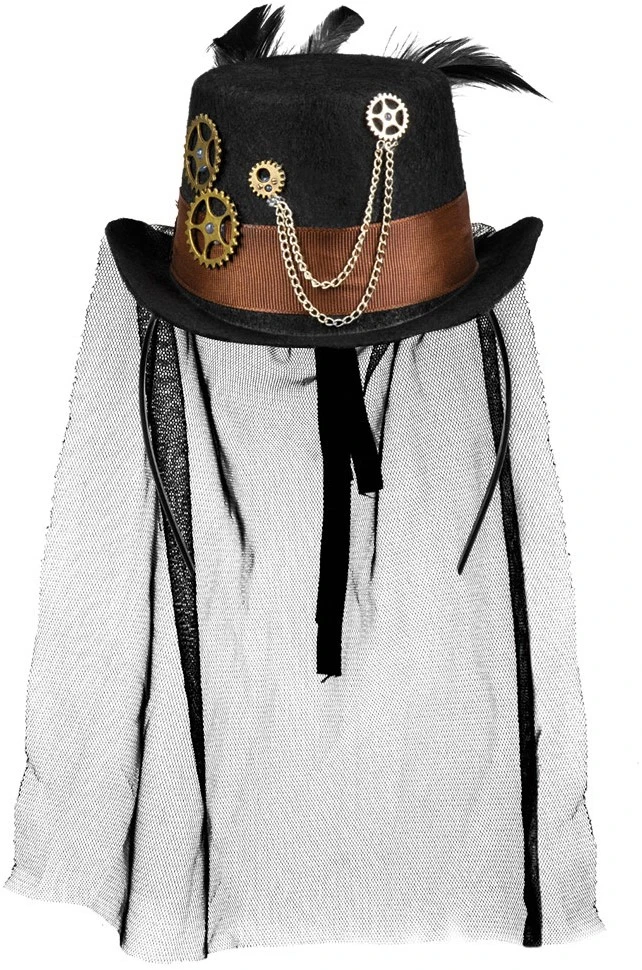 Details: versierd met een metallic bruine band, tandwielen en kettingen. Aan de achterkant zitten zwarte veren, linten en een zwarte sluier