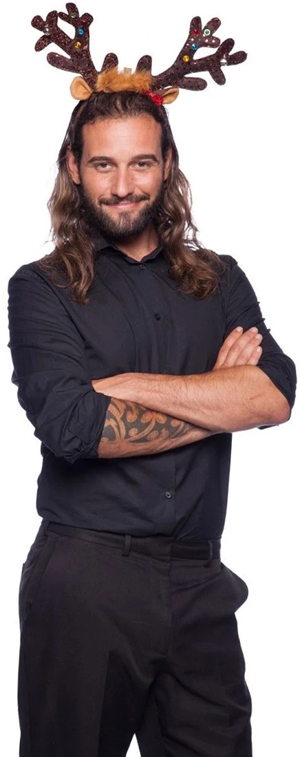 Zie er feestelijk uit met deze leuke diadeem! Er zit een groot bruin rendiergewei op met kleine oortjes en een rood strikje. Op het gewei belletjes en gekleurde steentjes, ook zit er in het gewei LED verlichting verwerkt in de kleuren rood, blauw en groen. Deze is met een drukknopje aan en uit te zetten, de lampjes kunnen op 3 verschillende snelheden knipperen.