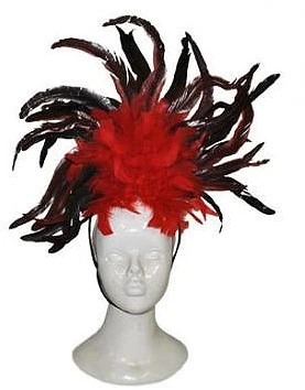Mooie grote diadeem met een verentooi. Bestaat uit zwarte en rode veren en is ongeveer 30 centimeter hoog.