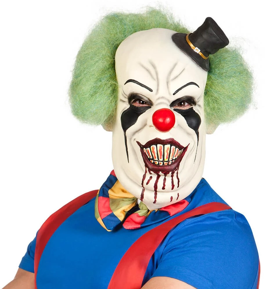 Een heel eng clownsmasker met bloed, uitgelekte make-up en een hoedje op! Hiermee laat je tijdens Halloween genoeg mensen schrikken.