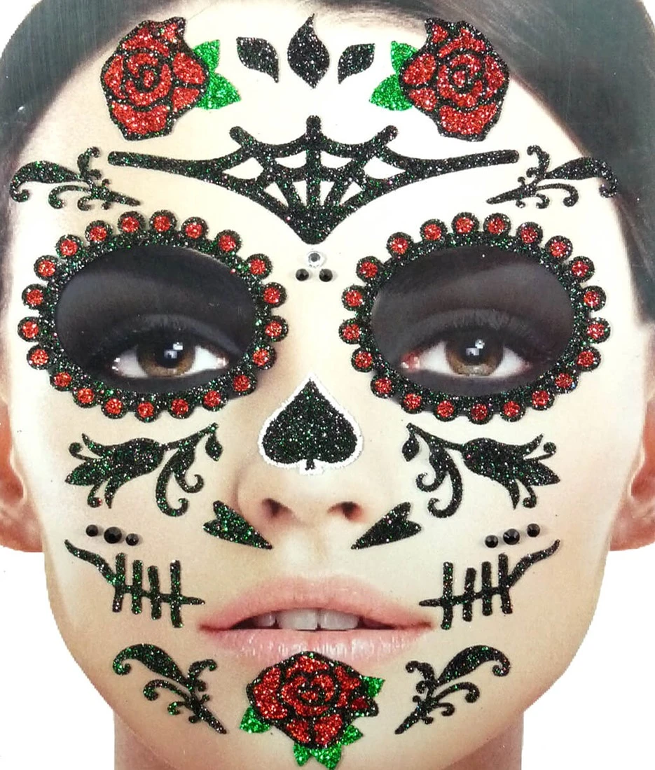 Met deze leuke glitter gezicht stickers maak jij jouw day of the dead look helemaal af. Je kunt de stickers natuurlijk ook op jouw handen of armen plakken.