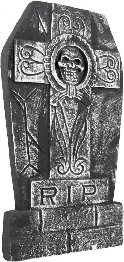 Details: de grafsteen heeft een kruis, skull en de tekst “R I P”