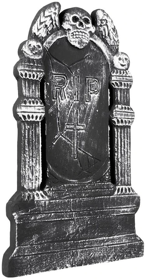 Details: de grafsteen heeft een skull met vleugels, kruis en de tekst “R I P”