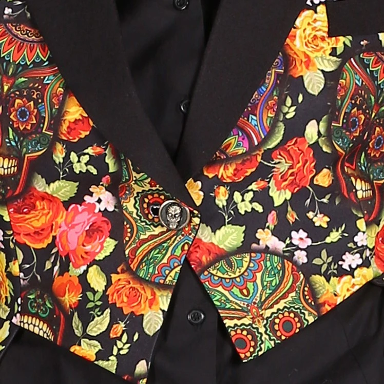 Kleurrijke dames slipjas met een opdruk van Mexican Skulls – Day of the Dead. De jas is gemaakt van 100% polyester. De jas sluit aan de voorzijde doormiddel van een knoop. Ook verkrijgbaar in een zwart/wit variant.