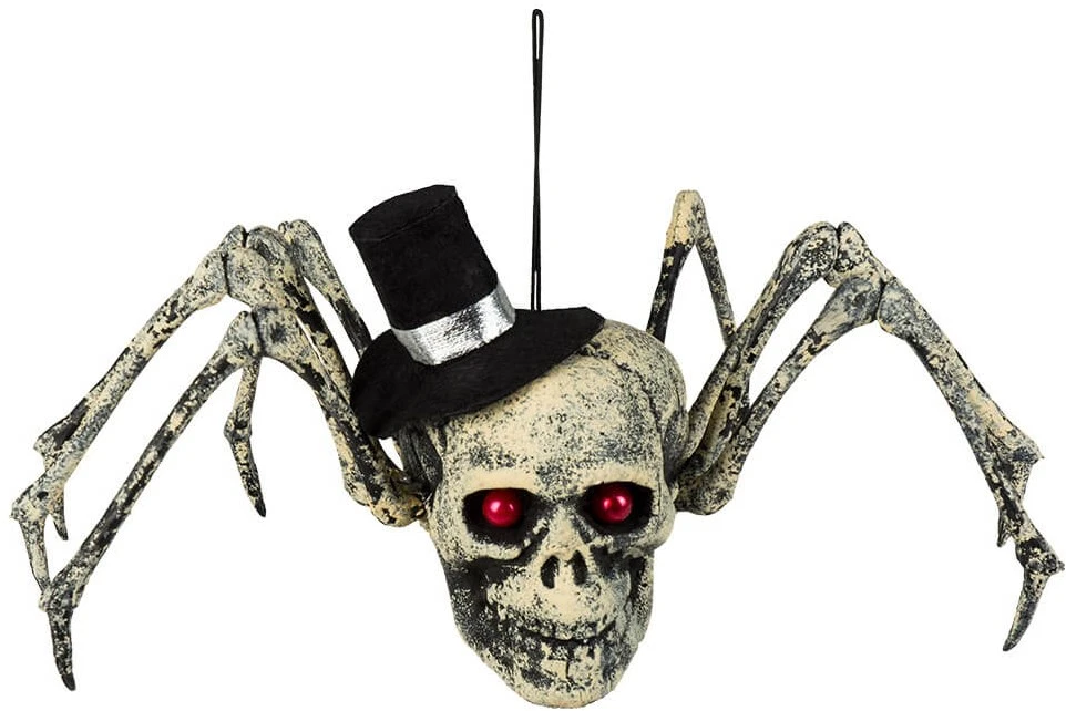 Details: schedel met spinnenpoten, hoed en rode kraaltjes als ogen