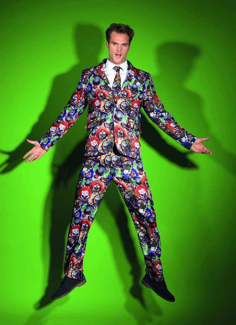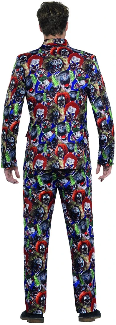 Een eng kostuum met een print van allemaal Evil Clowns. Ideaal voor Halloween, om er er toch in stijl bij te lopen, en ook nog eens de kinderen die langs de deuren komen laten schrikken!