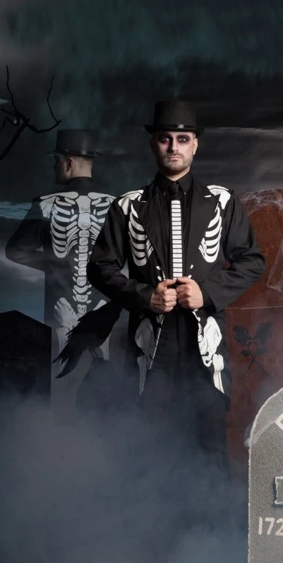 Een lange zwarte heren jas ideaal voor een halloween of griezelfeest. De jas heeft zowel aan de voorkant als aan de achterkant een opdruk van een wit geraamte. De skelet jas sluit aan de voorkant door een stukje klittenband, er zit 1 witte knoop op voor de sier.