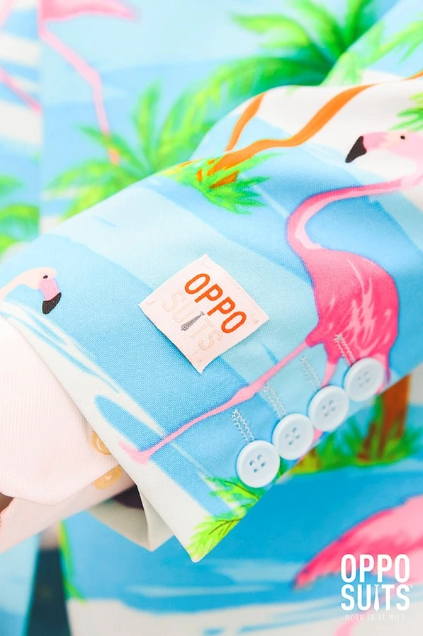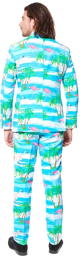 Dit verrassend tropische maatpak is zeker tof om deze zomer te dragen naar festivals, feesten of andere leuke gelegenheden. Of kies je er juist voor dit zomerse kostuum buiten de zomer te dragen? Alles kan in dit pak, niets is te gek.