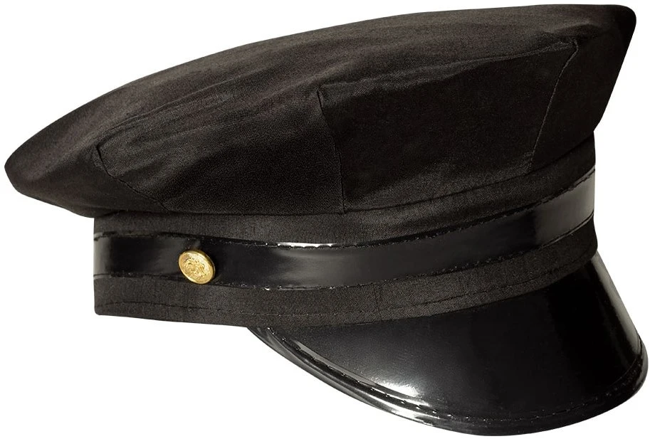 Details: de band en klep van de hoed zijn glanzend met goud kleurige knoppen