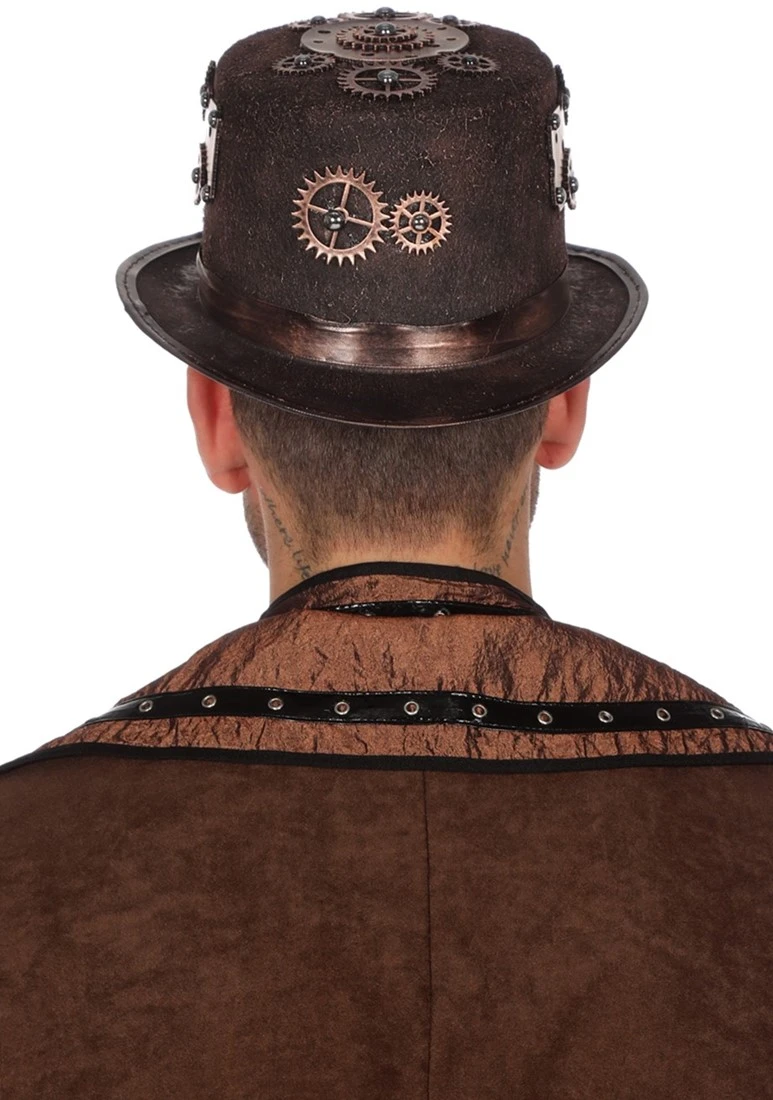 Details: op de hoed zitten allerlei tandwielen en andere industriële attributen zoals op de voorkant een drukmeter