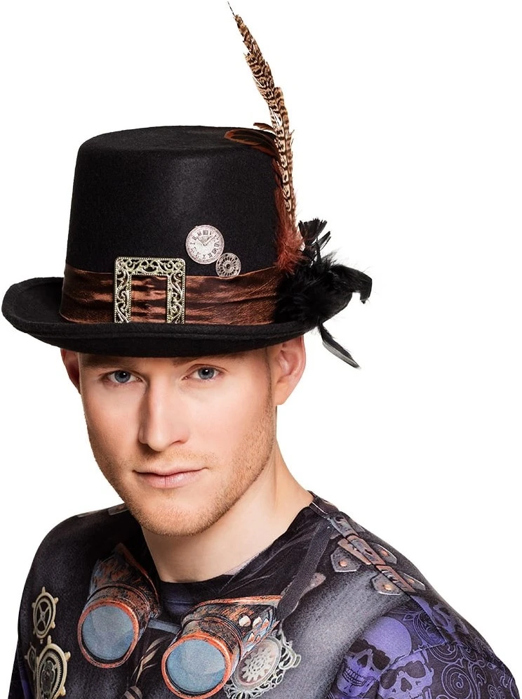 Details: versierd met tandwielen, een klokje, mooie veren en een zeer mooie gesp met donker koperen band om de hoed heen