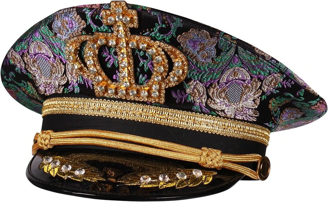 Detail: de pet is versierd met kleine steentjes en gouden kroon op de voorkant