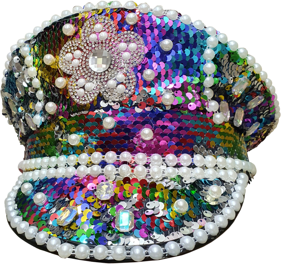 Details: de pet is versierd met witte parels en diamantjes
