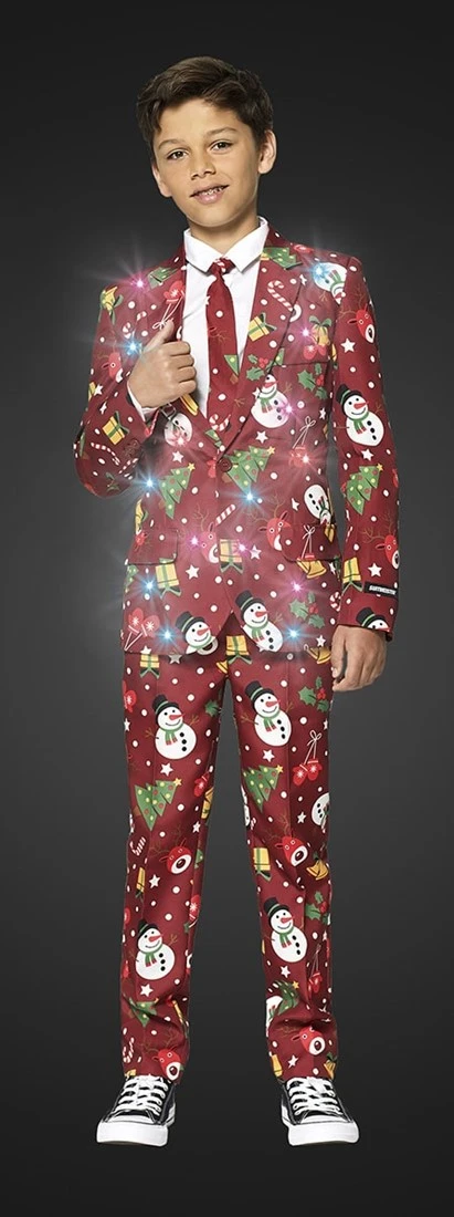Kerstdiner op school, met dit gave Light Up pak ben je helemaal de men en breng jij het licht in de donkere dagen! De verlichting werkt op een knoopcel batterij die makkelijk vervangbaar is. Door de batterij-container los te maken kan de jas gewoon gewassen worden.