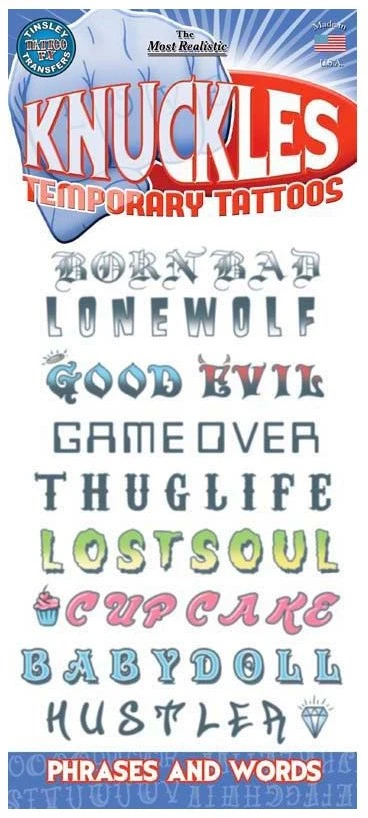 Met deze tattoo’s op je knokkels bent je net een echte gangster, gevangene, noem maar op. De set bestaat uit 9 ‘uitdrukkingen’ die per letter op elke knokkel te drukken zijn. Met water en een spons (sponsje is apart verkrijgbaar) zit de tijdelijke tattoo erg snel en gemakkelijk op je knokkels. De volgende uitdrukkingen zitten in deze verpakking (allemaal met hoofdletters):
