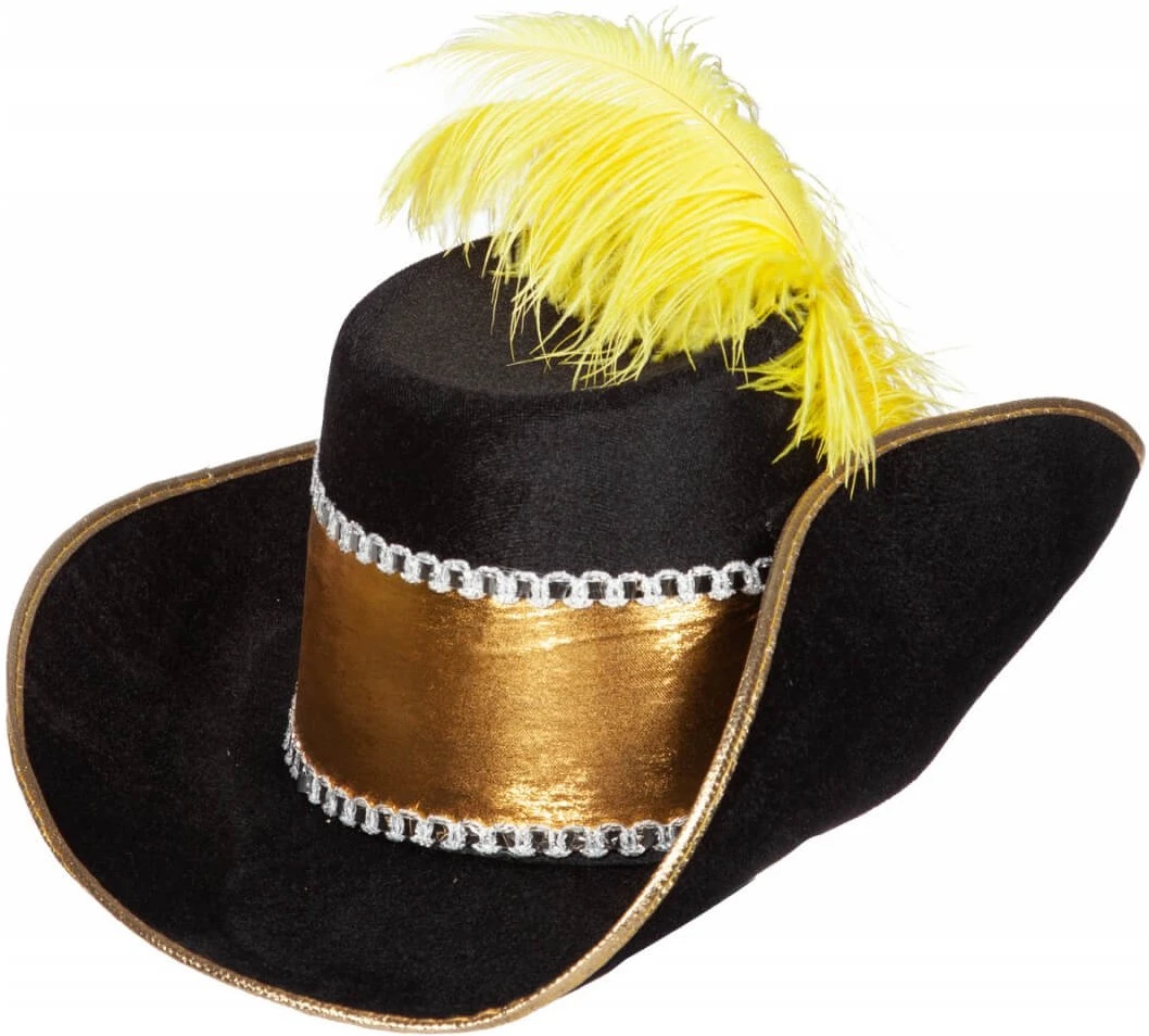 Details:Ā gouden band metĀ gele veer en eenĀ gouden rand langs de hoed
