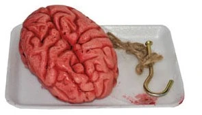 Dek je tafel op een griezelige manier met dit schaaltje! Op het schaaltje liggen hersenen die nog niet helemaal uitgelekt zijn. Het zit namelijk nog onder het bloed en het hangtouw zit er nog aan. Eet smakelijk!