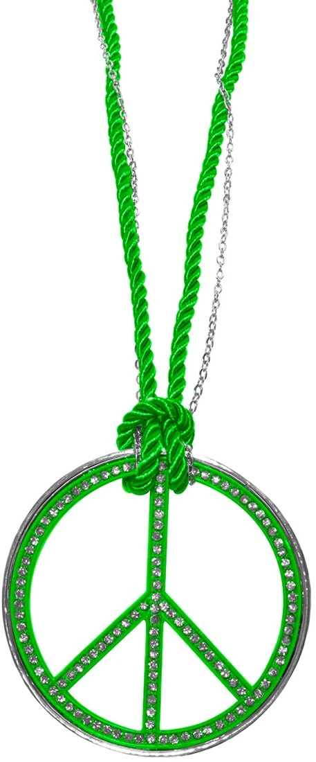 Een felgroene peace-ketting met ingelegde strass steentjes. De ketting hangt om je hals met een touw en een zilverkleurig ketting, welke aan elkaar vast zitten.