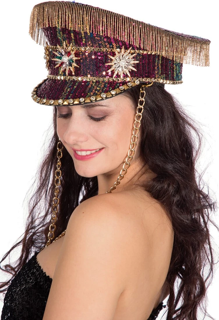 Details: pailletten, studs, strass stenen en kettinkjes langs de boven rand van de pet