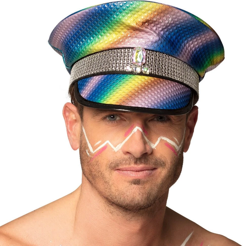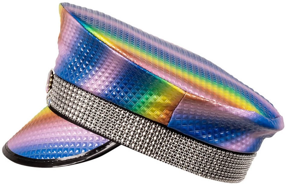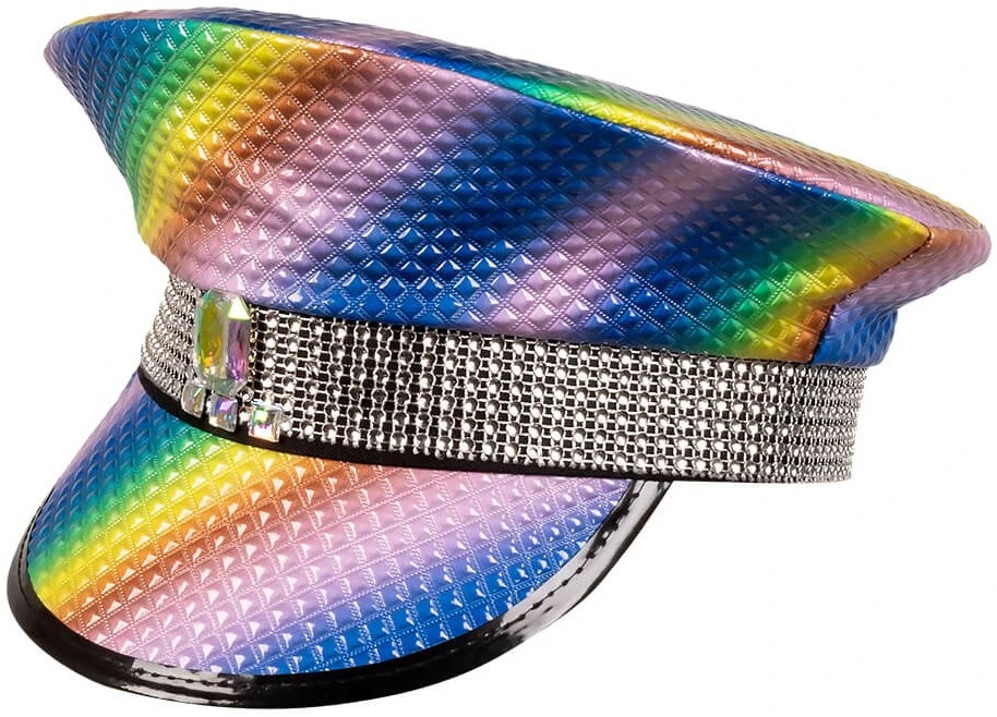 Details: leren look en de band van de hoed is zilver kleurig met voorop grotere strass stenen