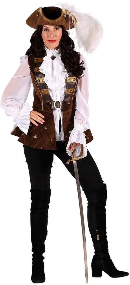 Compleet dames kostuum voor een enge piraat. Op de zwarte blouse staat de ribbenkast afgebeeld. Het kostuum is gemaakt van 100% polyester. Ook verkrijgbaar in een heren variant.