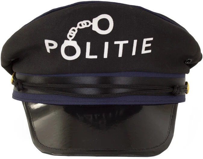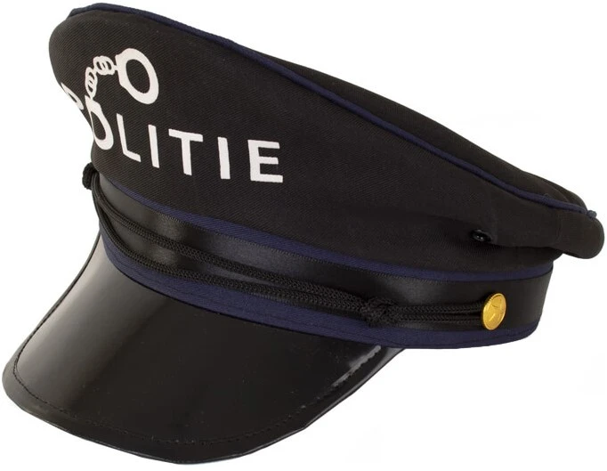 Politiepet met de tekst “POLITIE”, waarbij de ‘o’ creatief uitgewerkt is als handboeien.