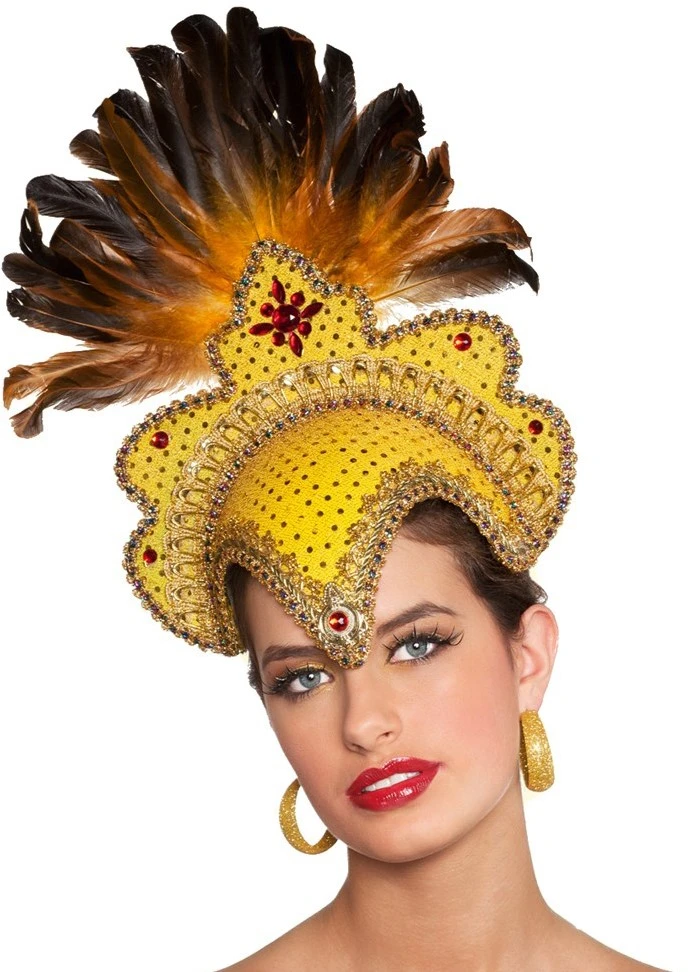 Details: Versierd metĀ gouden galon, pailletten, verenĀ en strass steentjes