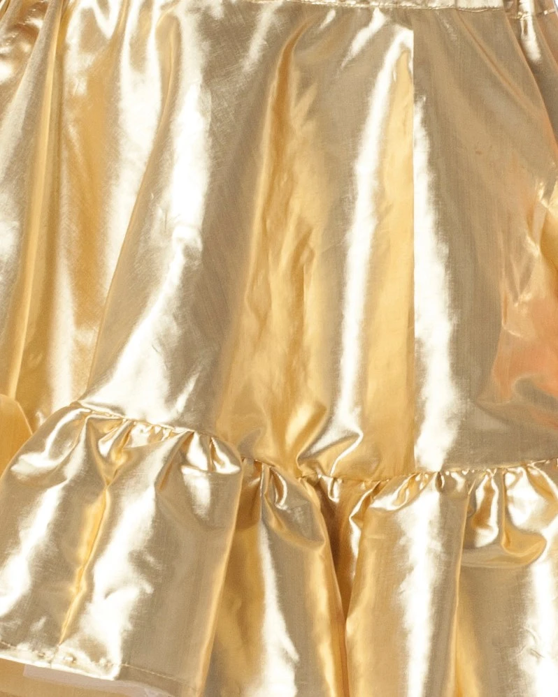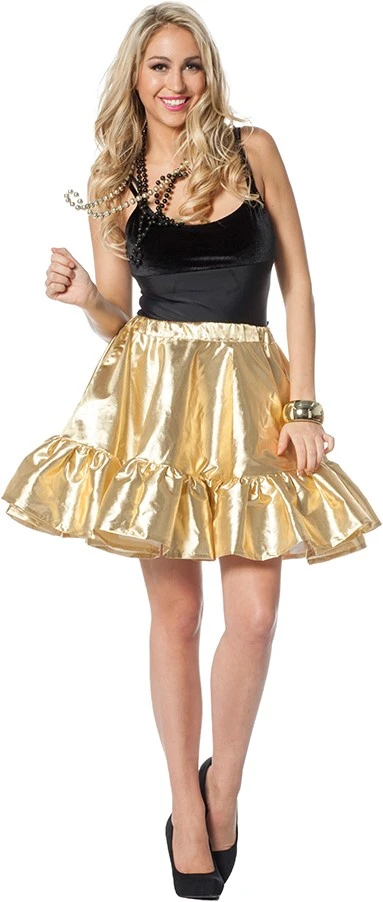 Mooie glimmende gouden dames rok. Aan de binnenkant van de rok zit een witte petticoat vast. Ook verkrijgbaar in het zilver.