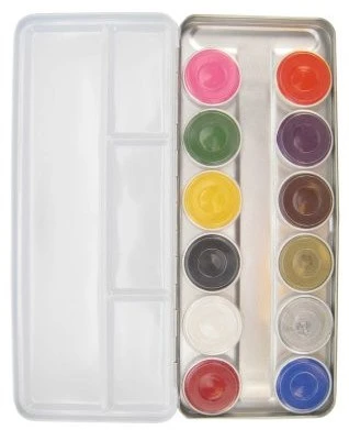 Schmink pallet met 12 kleuren: roze, groen, geel, zwart, wit, rood, oranje, paars, bruin, goud, zilver en blauw.