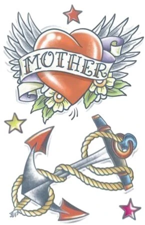 Stoere tattoo van een hart met de tekst ‘mother’ erin en een anker.