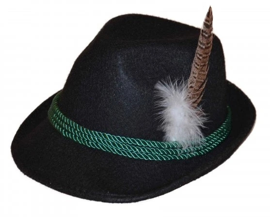 Dit mooie zwarte jagershoedje is ook goed te gebruiken bij Tiroler feesten of gelegenheden. De hoed is versierd met drie groene touwen en een mooie veer. De hoed is ook in andere kleuren verkrijgbaar.