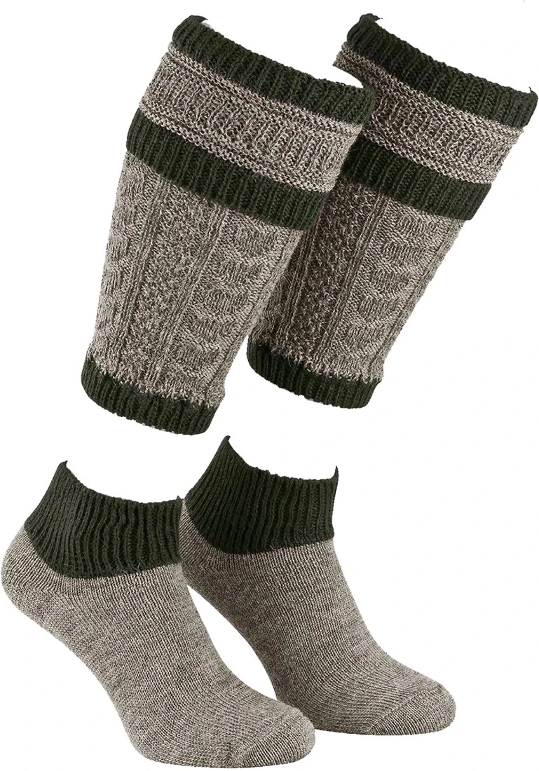 Met deze loferl set krijg jij geen koude benen en voeten! Deze loferl set bestaat uit een paar sokken en beenwarmers. Deze passen, zoals het hoort, prima onder een lederhose. Deze grijze loferl set is afgewerkt met groene randen. De sokken en beenwarmers zijn gemaakt van 50% wol en 50% acryl.