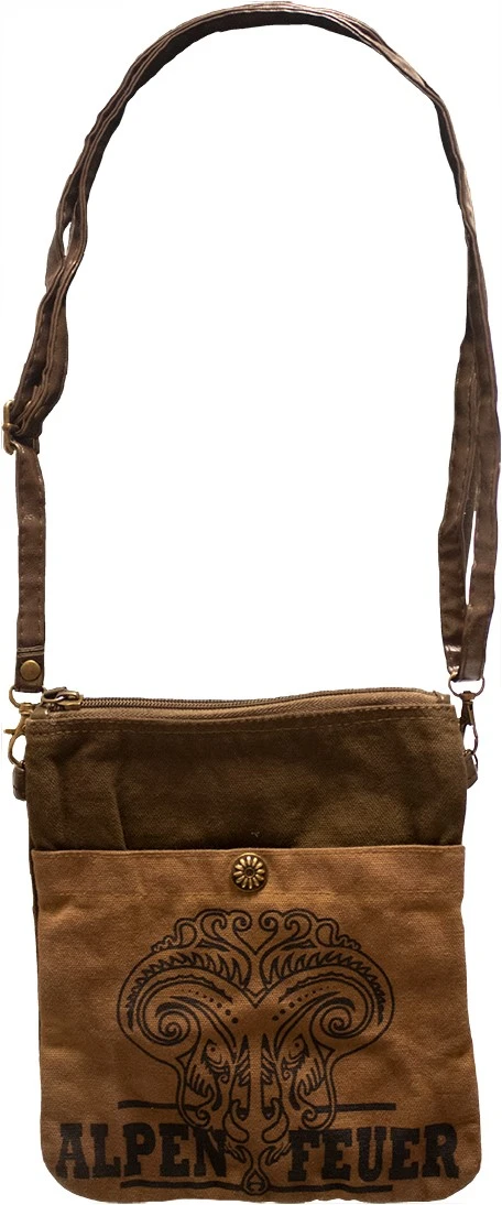 Leuke vintage tiroler tasje voor bij jouw Oktoberfest outfit! Het bruine tasje met de tekst “Alpen Feuer” en een steenbok erop, wordt geleverd met een afneembaar en verstelbaar riempje. In totaal beschikt het tasje over drie vakken. Het hoofdvakje met rits, aan de achterkant een vak met rits en aan de voorkant zit een vakje met een drukknop.