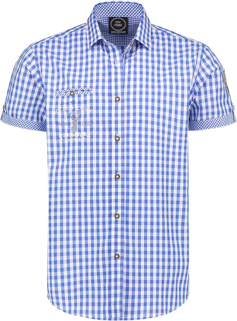 Zeer mooi tiroler trachtenhemd met een geblokt motief in het blauw/wit. Staat gewelding boven een van onze net zo kwalitatieve lederhosen.