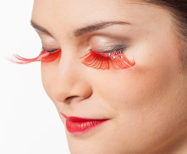 Details: lange oranje wimpers met in de hoeken zilveren diamantjes